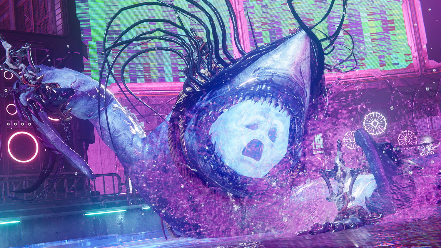 また、ステージの舞台となる東京は、青をベースカラーに、赤のアクセントを入れた、いかにも映画『ブレードランナー』や「攻殻機動隊」のようなサイバーパンク的な意匠で描かれており、降り注ぐ雨が荒廃したムードをさらに強調する。そうした世界をウォールランやグラップリングフックを駆使して駆け抜け、目の前に立ちはだかる敵を刀で鮮血とともに切り落としていく光景は、(「NINJA GAIDEN」の魅力を現代に受け継いだ側面のある)「Ghostrunner」シリーズとも共振するであろう、突き抜けたクールさがある。
