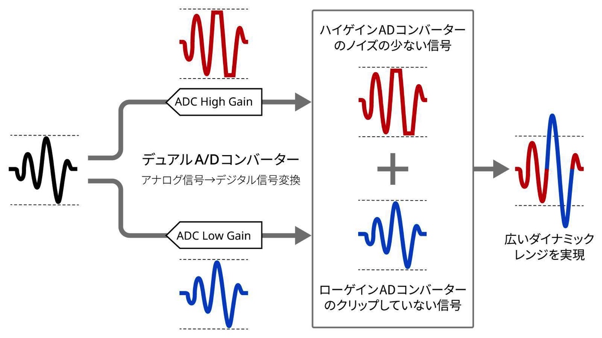 32ビットフロート録音は、編集時に音量を上げ下げしても解像度を維持できるメリットがあるが、デュアルA/Dコンバーターとの併用によって、どんな音量でマイクに入力されても歪まない音が録れるから実用度抜群だ。デジタル上でクリップしないだけでなく、アナログ段でも歪まないという未来感。さすがに「本当に?」と思った筆者は、イベントでティアックの担当者に聞いてみたところ、ドラムのキックなどを至近距離で集音するといった極端な大音量下においては、アナログ領域でも歪むことがあるとの回答を得た。つまり、本マイクの使用用途からして、歪むことはほぼあり得ないと言っていいだろう。ゲイン調整の必要がないのは、とても楽チンだ。