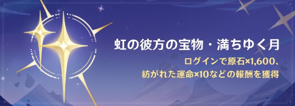 さらに9月28日からはイベント「虹の彼方の宝物・満ちゆく月」が開催予定。期間内にログインすることで、原石×1,600、紡がれた運命×10、聖啓の塵、祈聖のエリクシル、記念便利アイテムなどの報酬を獲得できる。