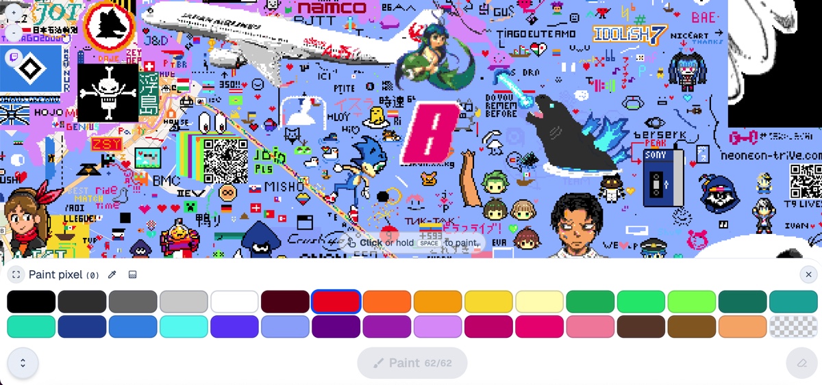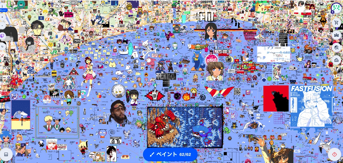 ちなみに国内の都心部はほぼドット絵が埋まっており、そういったエリアで新たに描き込むには、すでに描かれているドット絵の上から描く必要がある。大作を描こうとしているユーザーは線で場所取りをしている様子も見られるのだが、何度でもリアルタイムで上から描き込めるため、場所の取り合いや攻防も起こっているようだ。