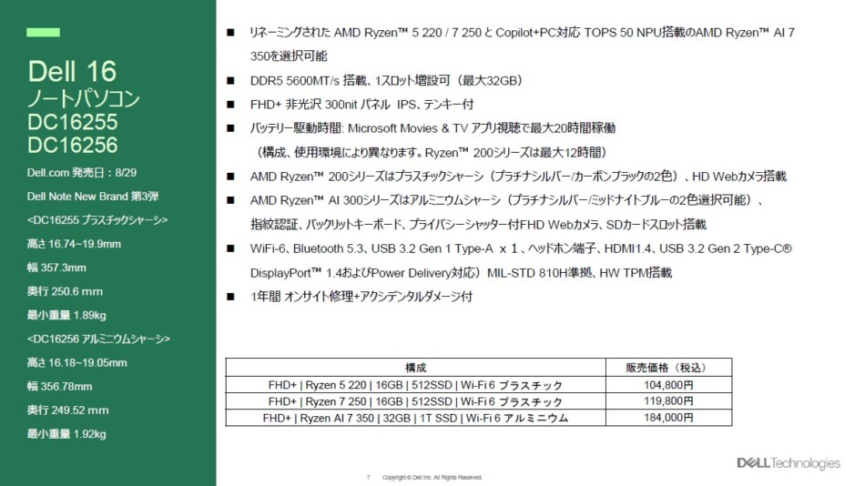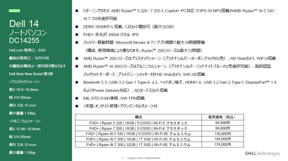 発表会でポロリと『Dell 14(Intel)』に関しても言及があったが、9月3日から販売開始となっている。こちらもアルミ筐体はCore 7-150Uのみと差別化が行われている。