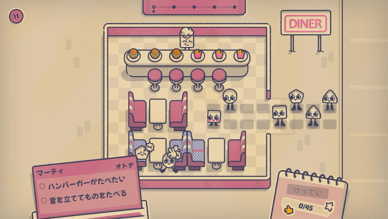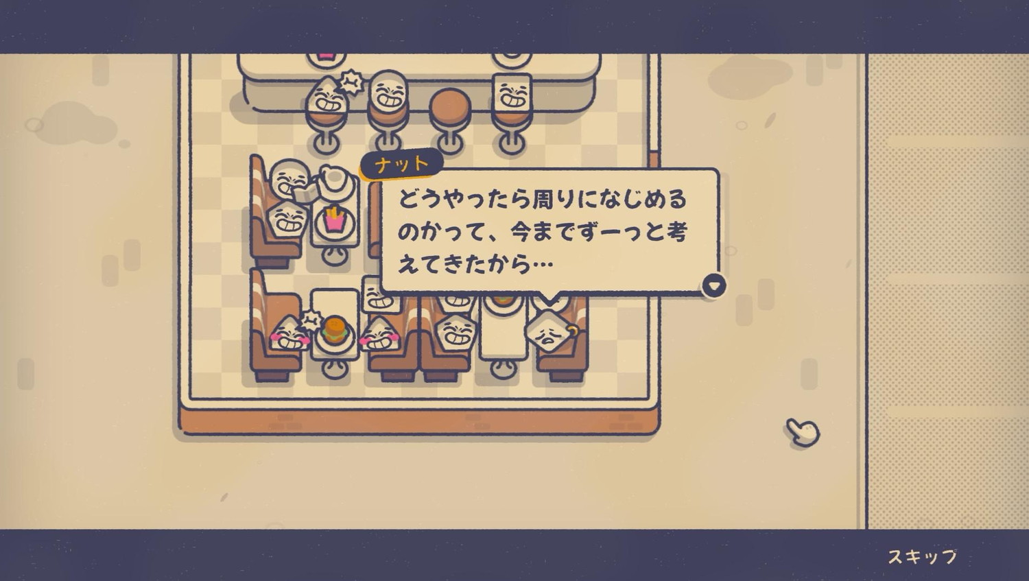 印象に残るか、好感を抱けるか。この違いは本作のストーリーにフレーバーを加えている。主人公のナットは自分探しの旅でいろんな国をめぐる。その旅路や暮らしのシーンにあわせて座る席の要望は変わる。そしてナットはあるマナー違反をしでかし、あこがれていた俳優の機嫌を損ねてしまう。それが自分も俳優を目指すきっかけとなり、後日、あこがれの俳優が機嫌を悪くした理由も知る。マナーとは不変ではなく気分で決まるものだ。マナーとは誰かを罰するものではないのだ。作中でそう声にしたワケではないが、マナー違反を防ぐパズルだからこその含みがある。意図できなかった失礼な行為に許しをあたえている、という意味でマナーのありようを考えるゲームだ。