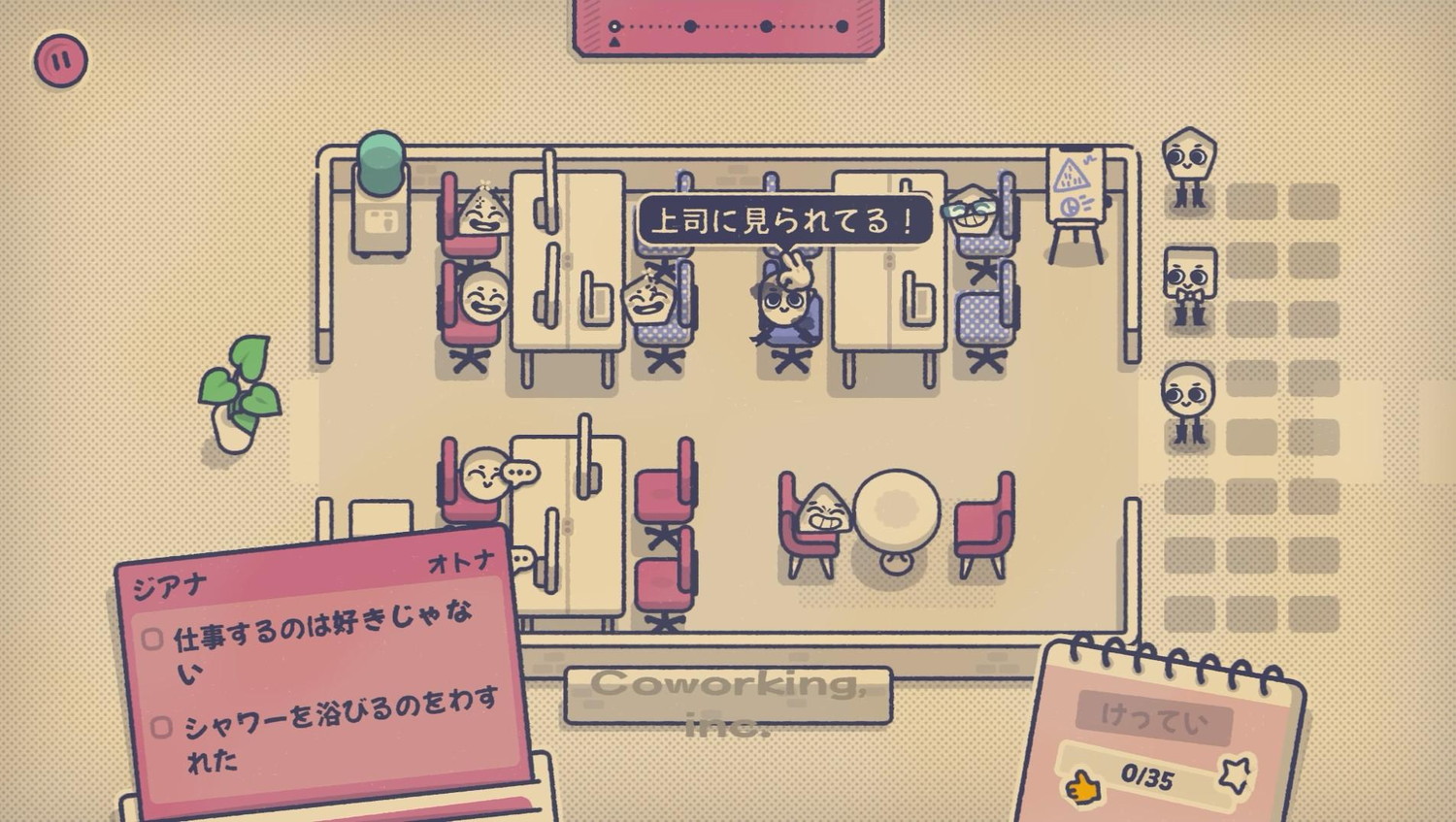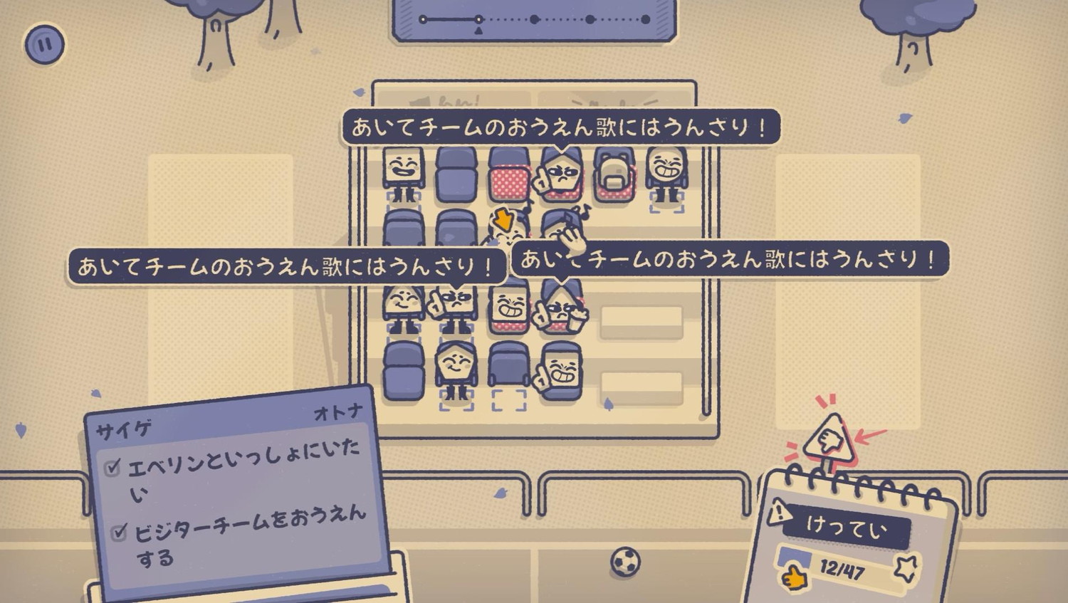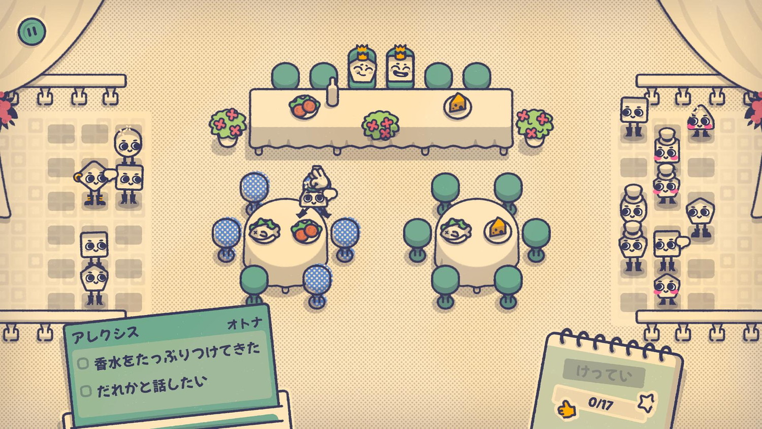 本作のプレイ感を例えるなら、実社会のシチュエーションから探した方がしっくりとくる。結婚披露宴の席決めがまさにそれだ。新郎新婦の近くに居たい、血縁や友人と一緒に居たい。人によっては苦手な食べ物があるだろうし、騒がしい人とおとなしい人は分けて座らせたほうがよい。参加者の要望を全て満たすとなればパズルゲームめいてくる。