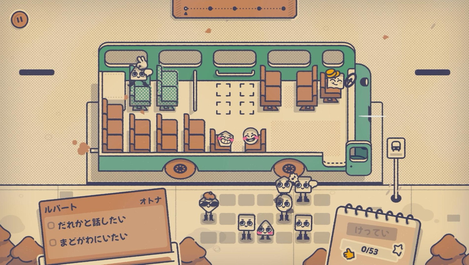 他人にはそう座ってほしい、という願望がそのままパズルの攻略手順になる。まずは同じ特徴を持つフォルムンたちをまとめて端に置く。音漏れヘッドフォンは壁際に寄せる、クチャラー同士で相席させる、なぜなら耳障りで目障りで邪魔だからだ。当たり障りのない席を用意しておけば、要望や特徴が少ないフォルムンに座ってもらうのがラクになる。現実でも、みんなそう座ってくれたならよいのだが。現実と理想のギャップで笑えた頃には、パズルのエスプリを堪能できているだろう。