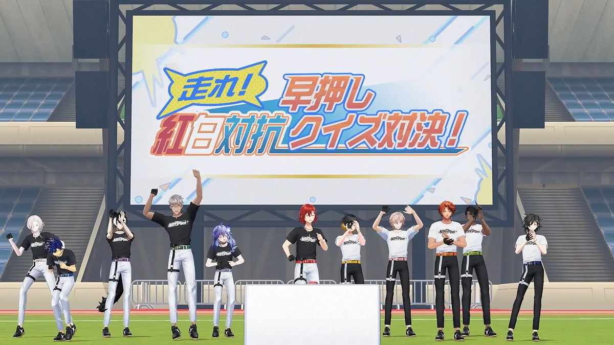 組分けは、紅組が花咲みやび(大将)、アルランディス(副将)、アステル・レダ、影山シエン、羽継烏有、水無世燐央。白組が、夜十神封魔(大将)、夕刻ロベル(副将)、奏手イヅル、律可、岸堂天真(体調不良で欠席)、荒咬オウガ。この組分けは6月に行われた配信番組のドラフト会議で決定されたものだ。