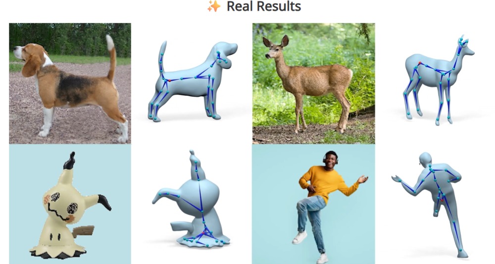 リグを追加するAIモデルは以前から存在しているが、RigAnythingは従来モデルより高速なリグ生成を実現した。その速度は従来比で20倍であり、あらゆるリグ生成を2秒以内に実行する。また、ヒト型、四足動物、海洋生物、昆虫といった多様な関節構造の3Dオブジェクトのリグ生成にも対応する。