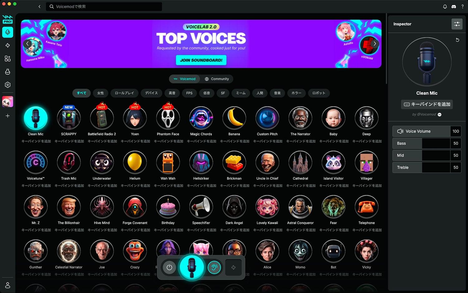 さらにアプリ内の機能である「Voicelab 2.0」を使えば、自身でこうしたカスタムボイスを制作することもできる。従来の「Voicelab 1.0」ではリバーブやピッチ、ディレイなどの各項目を数値で調整するシステムだったため、知識の無いユーザーではいささかハードルが高かった。しかし、新しい「Voicelab 2.0」ではビジュアルアイコンを選択していく直感的な方式に変更。AIキャラクターやデバイス演出効果、プリセットマイク、背景音、空間効果といった設定項目を自身で選択することで、簡単にオリジナルボイスを作ることができ、他の『Voicemod』ユーザーに向けて公開することも可能。それはつまり、ほかのユーザーが作ったボイスを使用することもできるということだ。