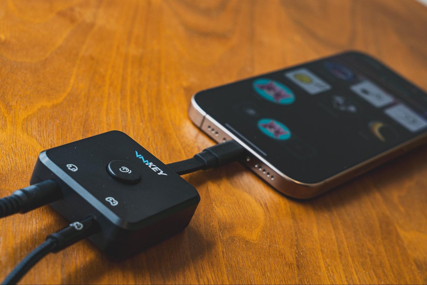 使用方法はシンプルで、本体のUSB Type-C端子をスマホに接続し、同時に本体と有線ヘッドセット、コントローラー等のヘッドセット入力ジャックにそれぞれ3.5mmオーディオケーブル(TRRS)でつなぐだけ。これにより、ヘッドセットのマイク音声は 『Voicemod Key』+スマホを経由してコンソールゲーム機に入力され、ゲーム&ボイスチャット音声は逆順をたどってヘッドセットのスピーカーから出力されるようになる。