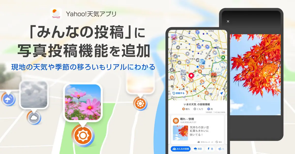 LINEヤフーは、累計6,800万ダウンロードを突破した「Yahoo!天気」アプリにおいて、ユーザー参加型の「みんなの投稿」モードに“写真投稿機能”を新たに導入した。