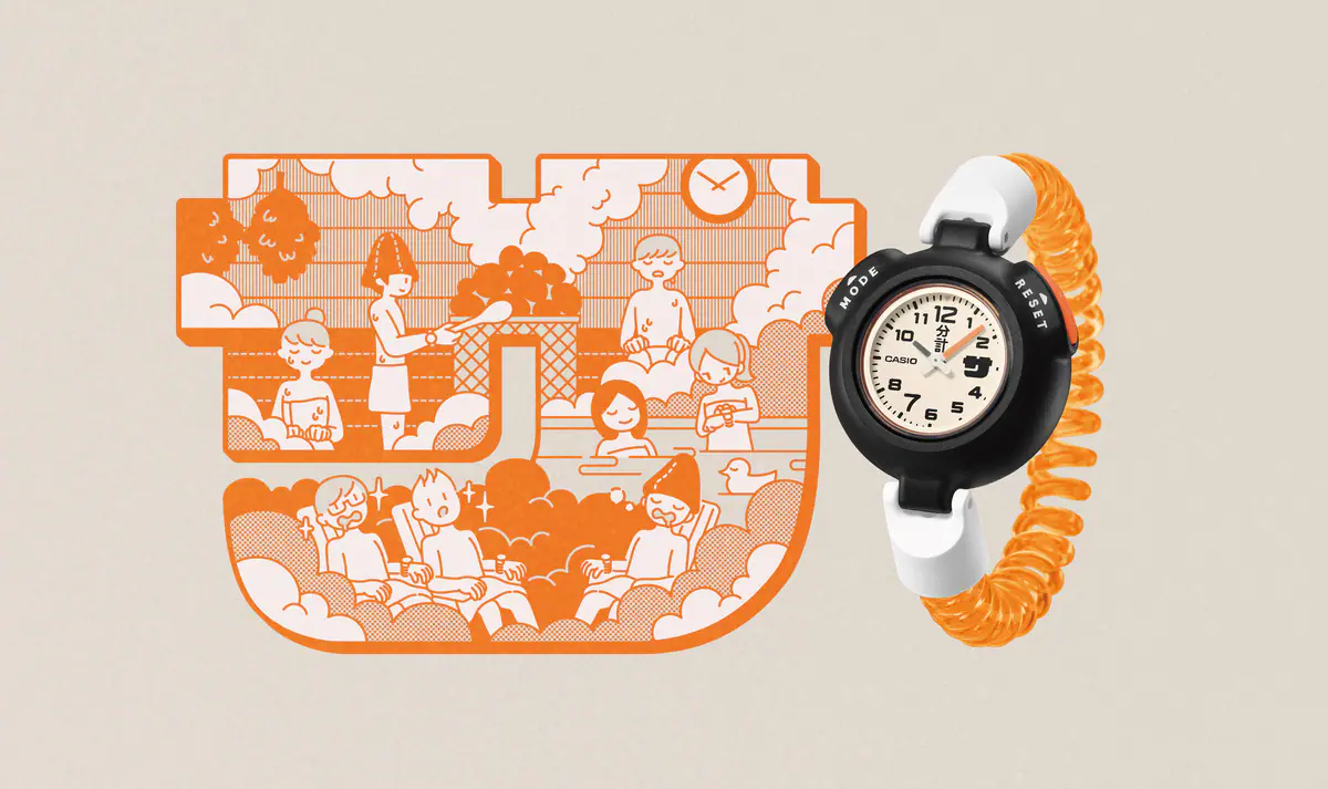 カラーはオレンジバンド×白文字板の『SAN-100H-7B』、ブラックで統一した『SAN-100H-1B』の2種類。着脱しやすいカールバンドを採用し、温浴施設での使用にも馴染む仕様だ。さらに、サウナ・水風呂・外気浴を描いた専用パッケージ入りで、ギフトにも最適な仕上がりになっている。