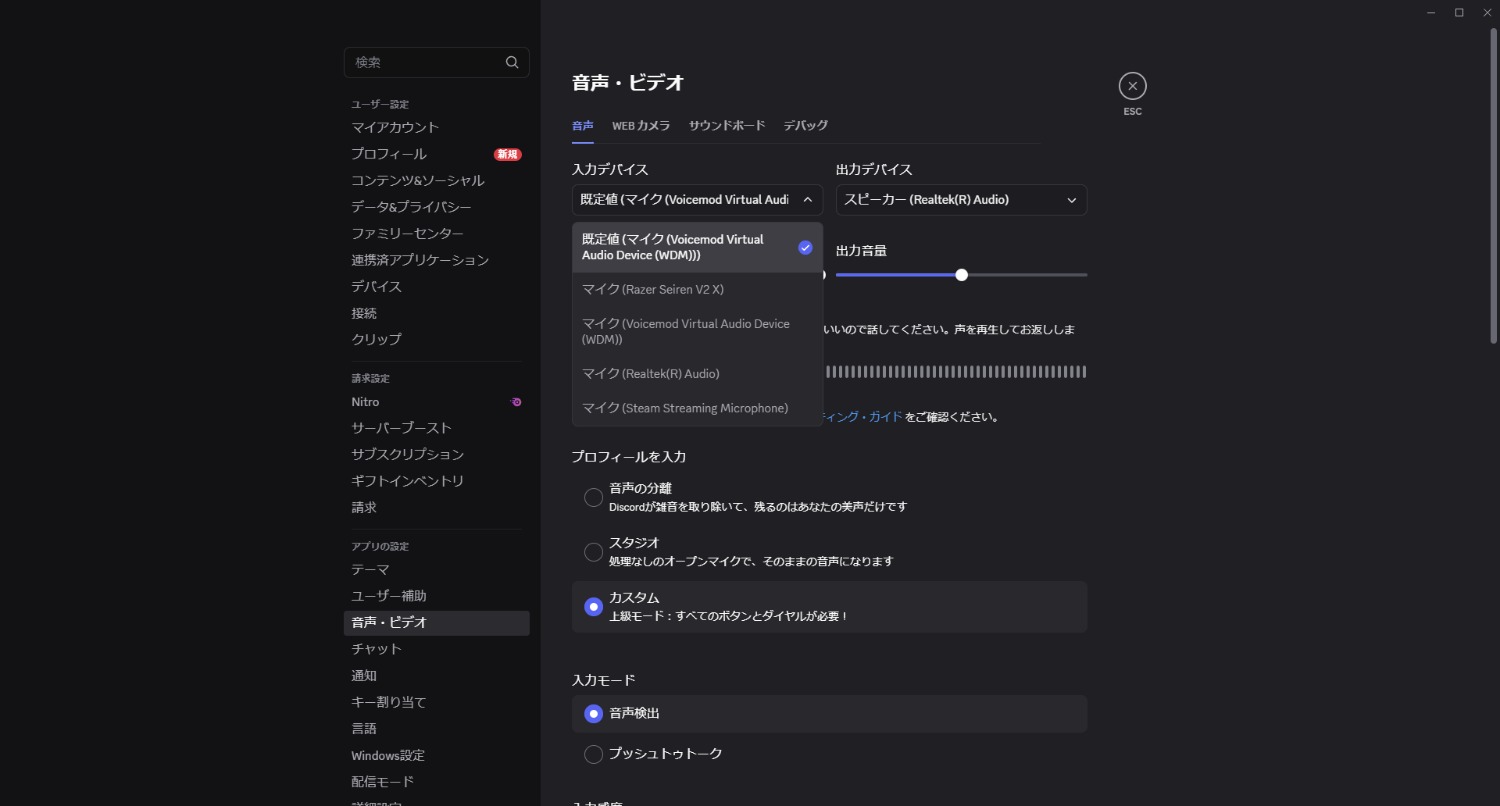 ただし、Discordのボイスチャットで使用する場合は「音声&ビデオ」から「入力デバイス」を「Voicemod Virtual Audio Device」に変更する必要があるのでお忘れなく。使用後は入力デバイスをいつものマイクに戻せば問題ない。
