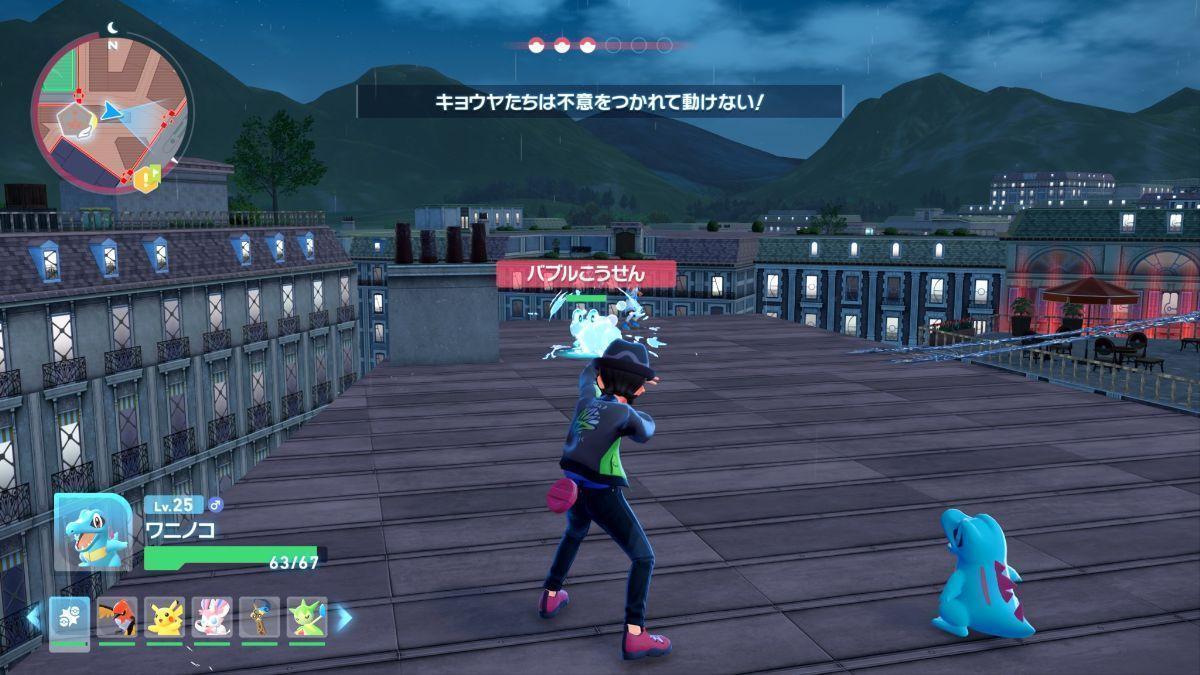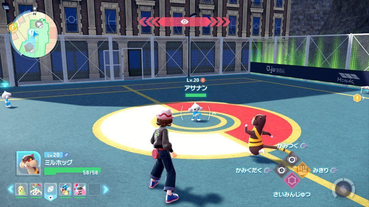 またトレーナーに近づくと表示される「気配ゲージ」が最大になると、気づかれて勝負を仕掛けられてしまうが、本作では『ポケットモンスター』では初めてプレイヤー側から気づかれないように攻撃をくり出せば不意打ちすることが可能。不意打ち時の攻撃は必ず急所に当たるためバトルを有利に運ぶことができるが、実際にプレイしてみると慣れないうちは不意打ちを仕掛けるのが非常に難しかった。スタッフによると、しゃがみながら目線を外すことが重要とのことだったので発売後に試したい。またミッションは必ずしも達成する必要はなく、あくまでポイントが目標に達すればよいため、余裕があれば試すなどの温度感で挑むのがいいかもしれない。