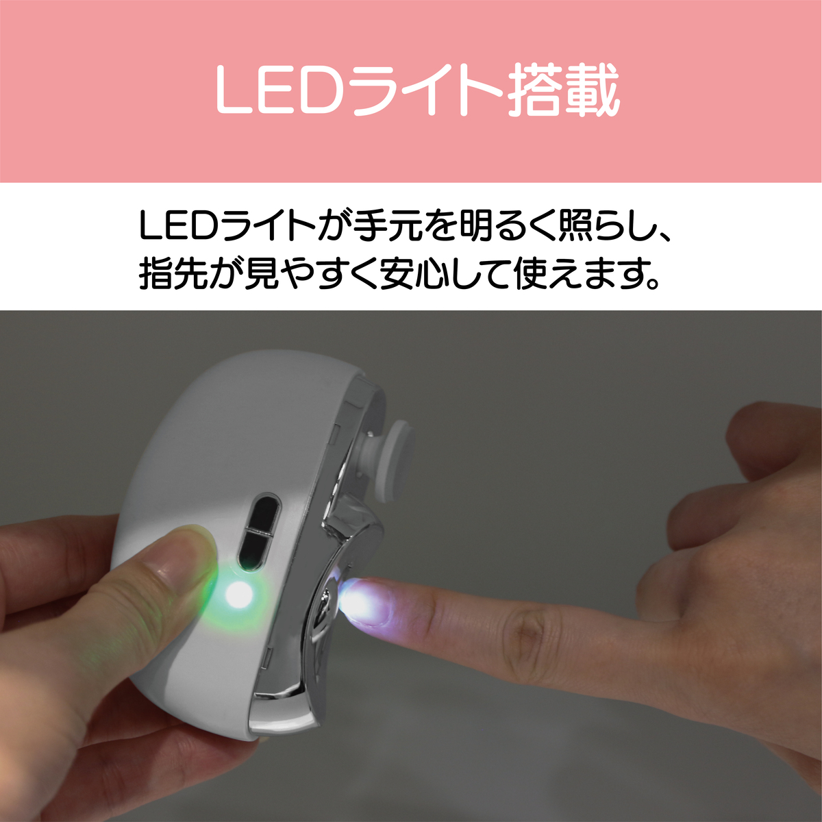 操作はボタンひとつで簡単に行え、回転スピードは2段階調整が可能。爪の硬さや仕上がりの好みに合わせてスピードを選べる。LEDライトが手元を照らすため、暗い場所や視界が狭い状況でも安全に使用できる。また、チャイルドロック付きで誤作動を防ぎ、約10分で自動的に電源が切れるオートオフ機能も搭載している。
