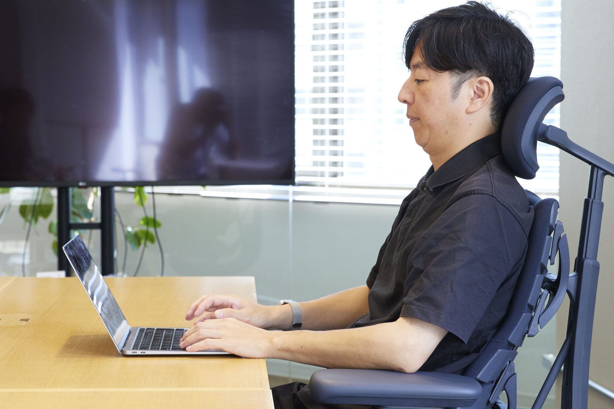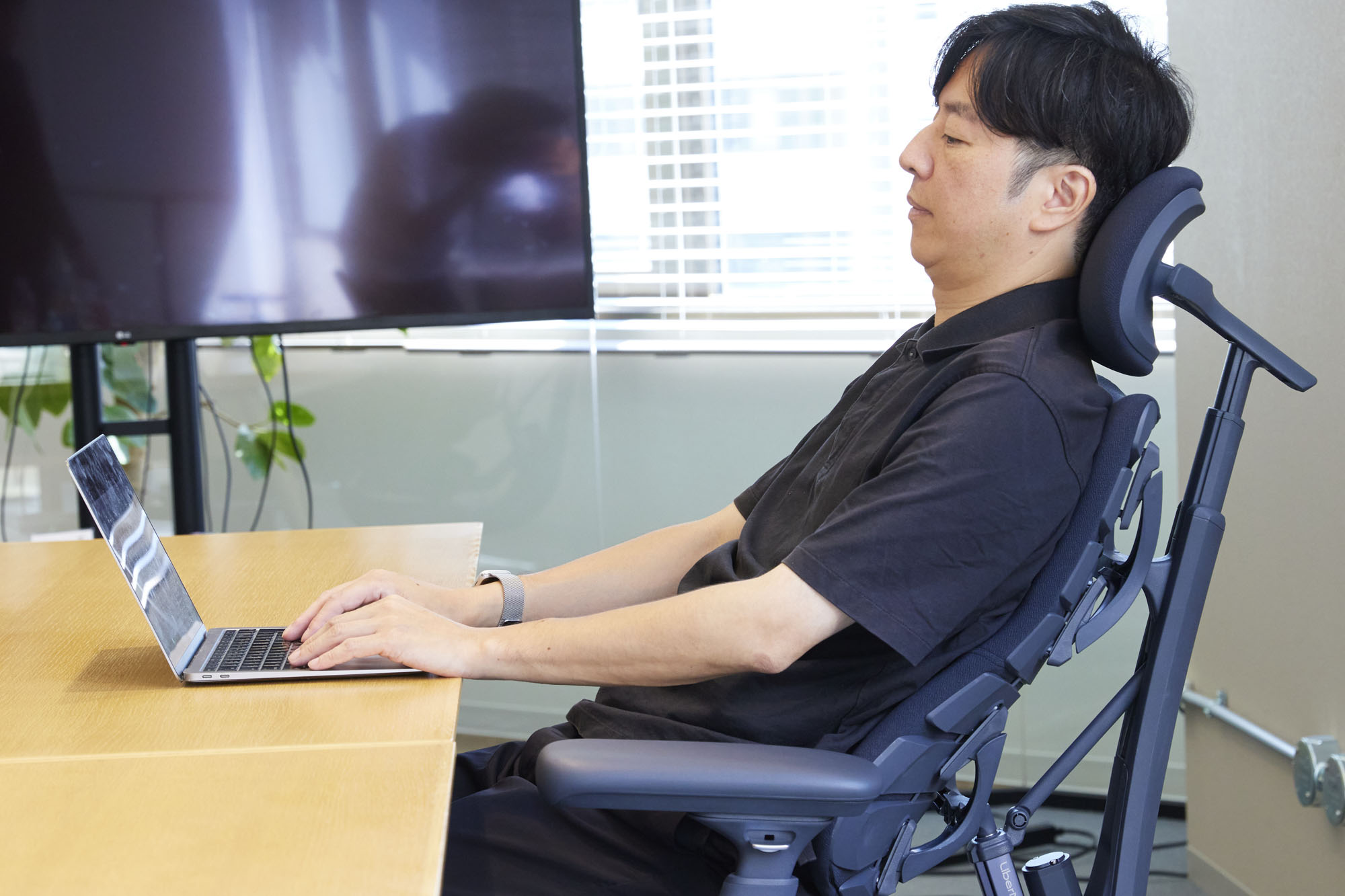 「『LiberNovo Omni』の最大の特徴はまさにこの機能でしょうね。座っていて背骨がいちばんラクな状態になるように調整してくれるわけです。しかも、背もたれの角度はほぼ直立のディープフォーカスからソロワーク、ソフトリクライニング、スパインフローまで4段階あり、いわゆるリクライニングであるスパインフローでは160°まで開きます。個人的には快適にPCタイピングが行えたのは、直立とソフトリクライニングの中間であるソロワークでした。とにかくカラダがラク。長時間PC作業を続けても集中できて、疲れ方が全然違いますね」
