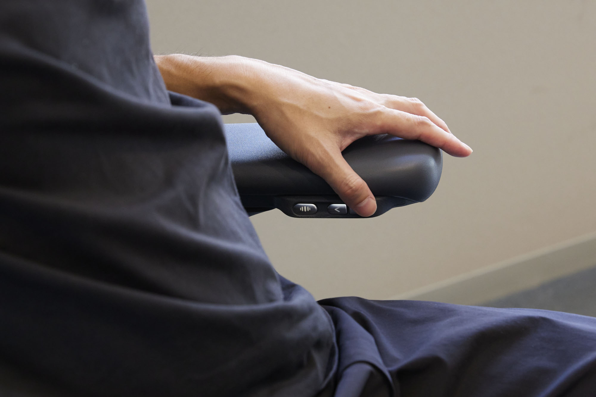 続いて、左アーム部にあるボタンで背もたれ部を自分のカラダにフィットさせていく。