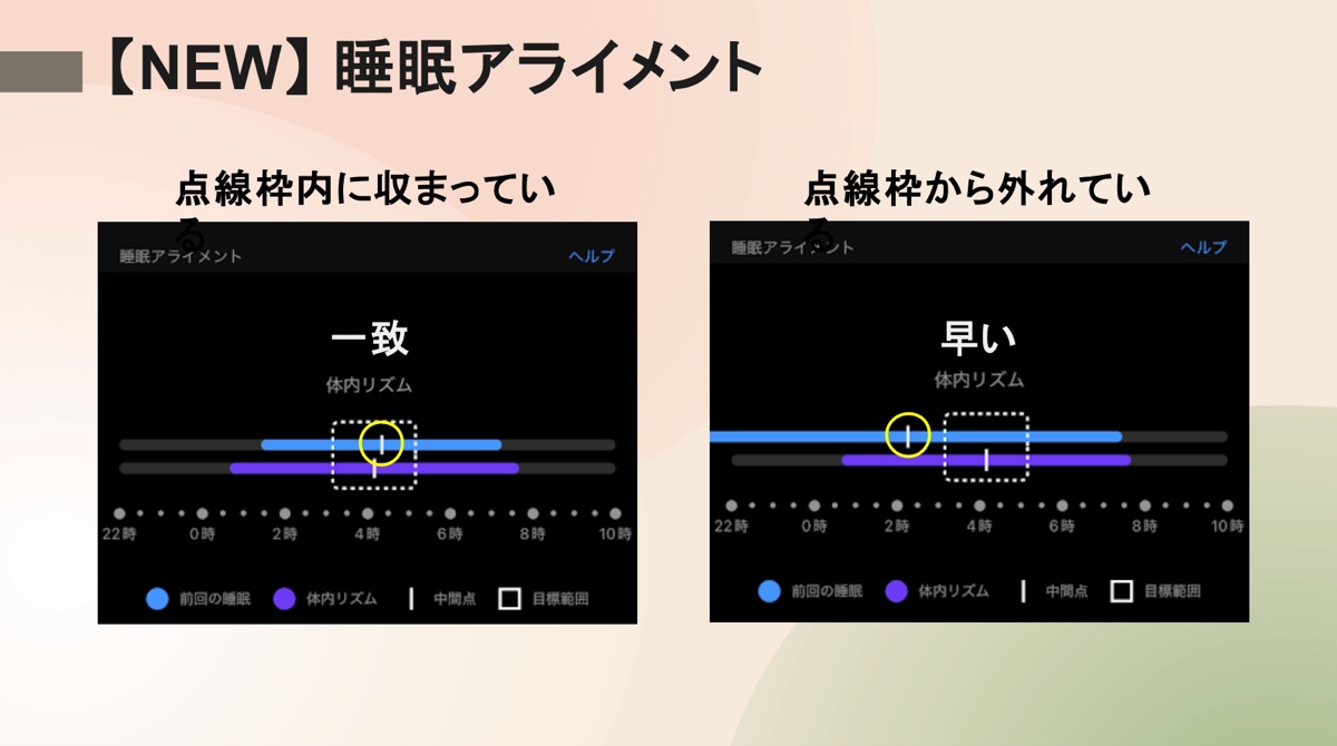 実際にどのようにして計測するのかというと、まず前日の睡眠時間の中間点と、体内リズムの中間点が画面に表示される。この2つの中間地点を比較し、一致、不一致、速い、遅いという4段階で評価する。2つの中間点が点線枠内に収まっているかどうかで、体内リズムに合った睡眠が取れているかを計測するのだ。