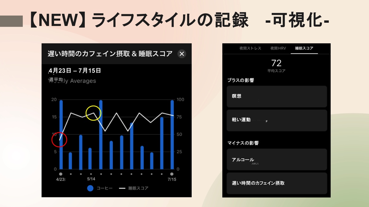 生活習慣は、睡眠の質にも深く関わってくる。筆者も「なんでかわからないけど、眠れないな……」と感じることが多々あるのだが、もしかしたら無意識のうちに飲みすぎていたコーヒーが原因かもしれない。そういった何気ない行動が、その日の睡眠にどういった影響を与えているのかを改めて知ることができるのだ。