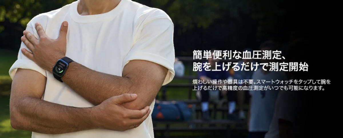 デザイン面では、前モデルから約10%の軽量化と約12%のスリム化を実現し、血圧計内蔵とは思えないコンパクトなフォルムに進化。カフへの空気送気も静音化され、夜間の自動測定時でも快適に使用できるよう配慮されている。TPU樹脂製のベルトは柔らかく、長時間の装着でも肌への負担が少ない。画面も1.82インチへと大型化しつつ、全体としてはよりスマートな印象に仕上げられている。