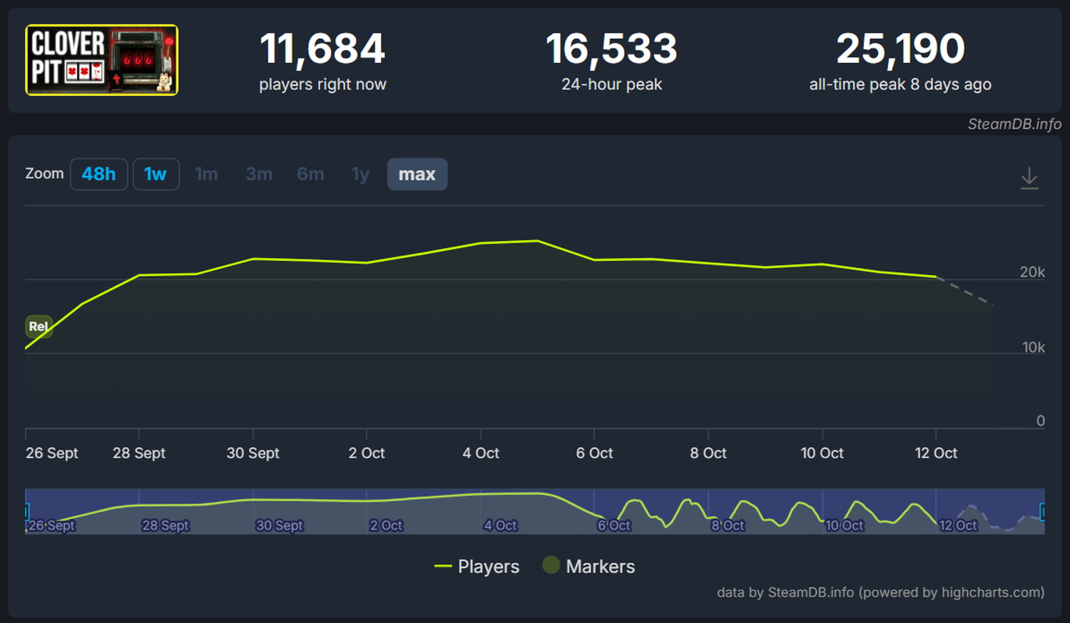 そうした対応が功を奏してか、『CloverPit』はスタートダッシュに成功。Steamにはすでに1万件弱のユーザーレビューが寄せられ、上から2番目のランクである「非常に好評」へと分類されている。開発元のPanik Arcadeによると、リリースから2週間で75万本以上を売り上げているとのこと。現在もその勢いは陰りを見せず、連日2万人以上が同タイトルをプレイしているというデータもある。