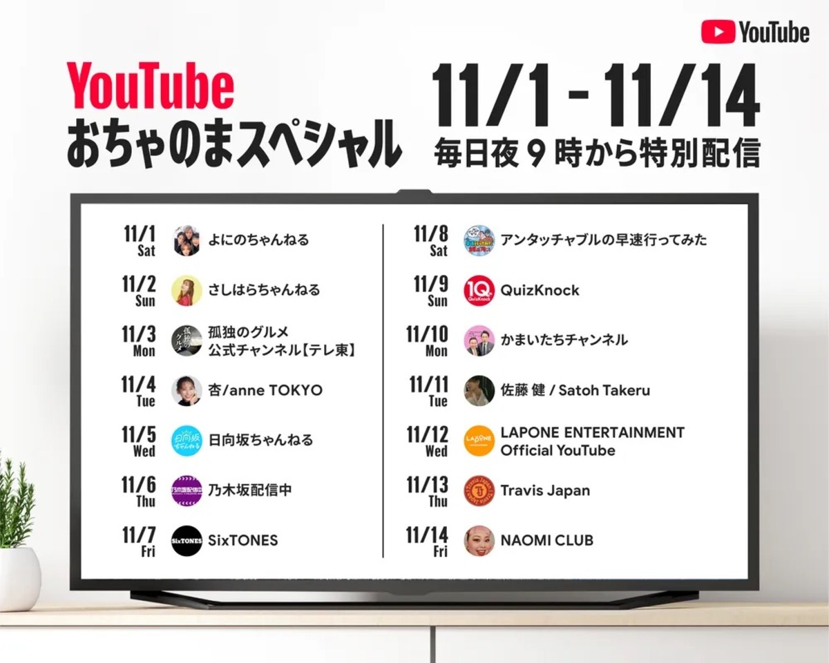 YouTubeは、コネクテッドテレビ(CTV)での急成長を記念し、初の試みとなる『YouTube おちゃのまスペシャル』を発表した。開催期間は11月1日から14日まで。期間中は毎晩21時に、人気チャンネルによる撮り下ろしの特別コンテンツがプレミア公開される。