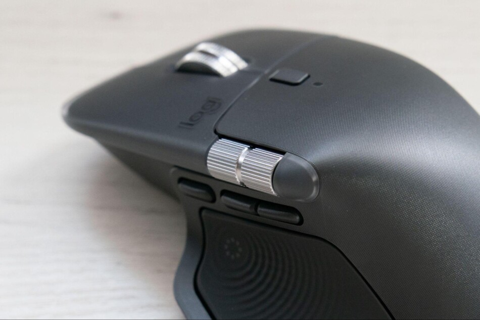 『MX Master 4』は8ボタン・2ホイールの多機能マウスだが、特に特徴的なのは左側のレイアウト。水平スクロール用ホイールに加え、親指を自然に置ける羽根状のサムレストを備える。
