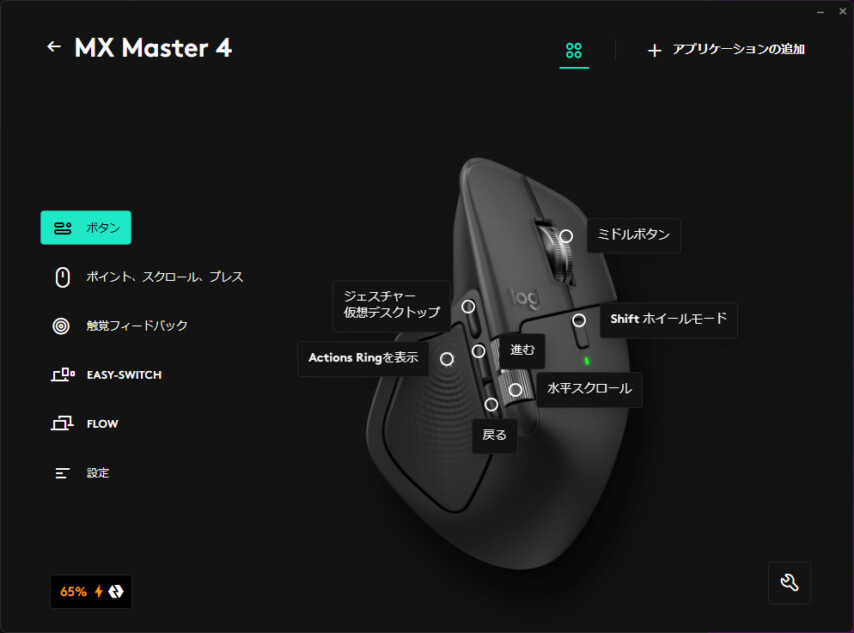 アプリを起動すると、『MX Master 4』を自動で認識し、デバイス内のアプリに合わせたプリセットプロファイルを即座に読み込んでくれる。
