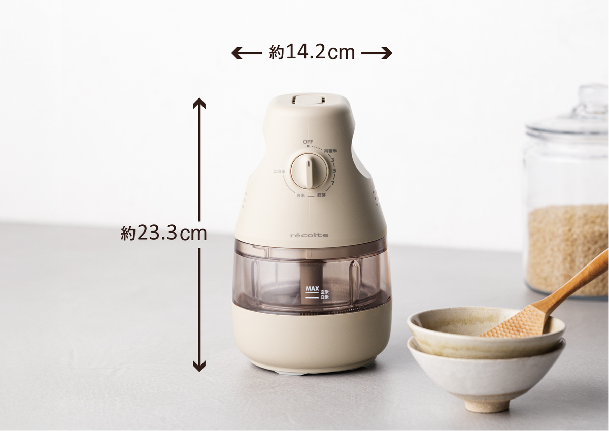 本体は約14cm幅のスリムサイズで、2合までの少量精米に対応。毎日使うことを想定した省スペース設計となっており、食卓や棚の上にも置きやすい。