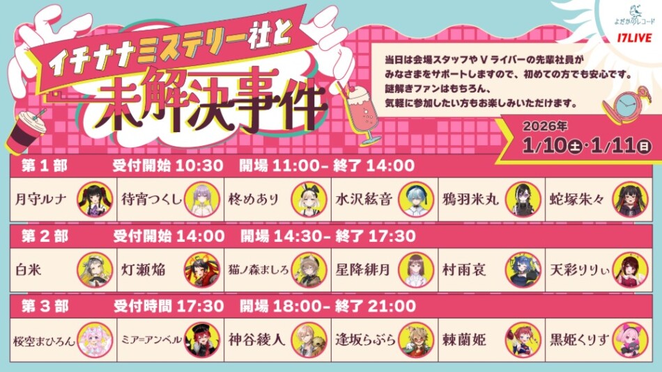 17LIVEは、Vライバー18名が参加する謎解きコラボカフェ企画「ようこそ、イチナナミステリー社へin SHIBUYA」を2026年1月10日と11日に開催すると発表した。