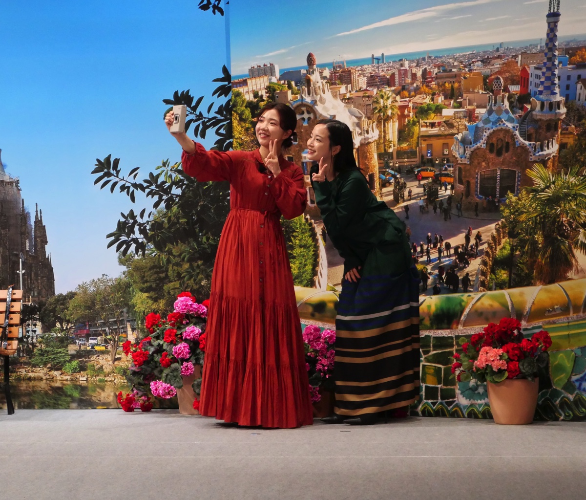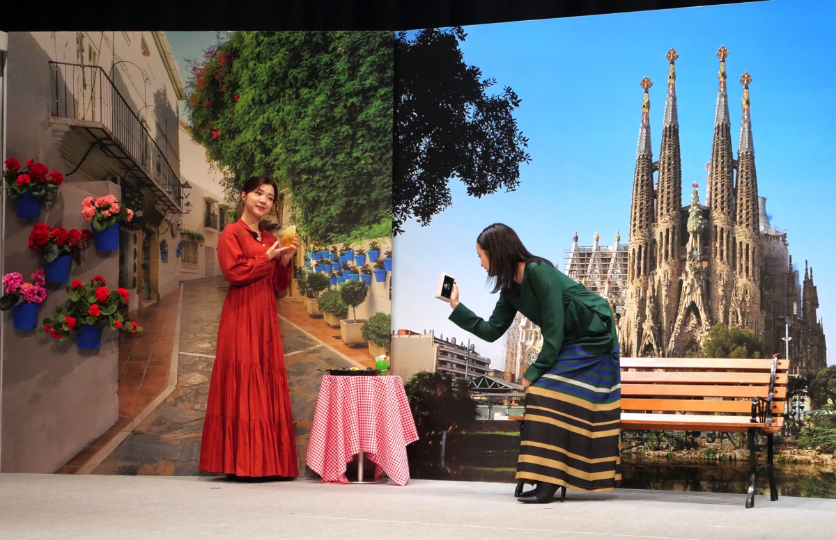 そして今回は、広瀬が以前から行きたかったという“スペイン”の風景が舞台上に用意され、2人で『instax mini LiPlay +』を使った擬似旅行をすることに。広瀬が「Layered Photo Mode」で撮影したところ、福田が細長く写ってしまったようで「センスが……申し訳ない」と言いつつ、笑いが起こるシーンとなった。