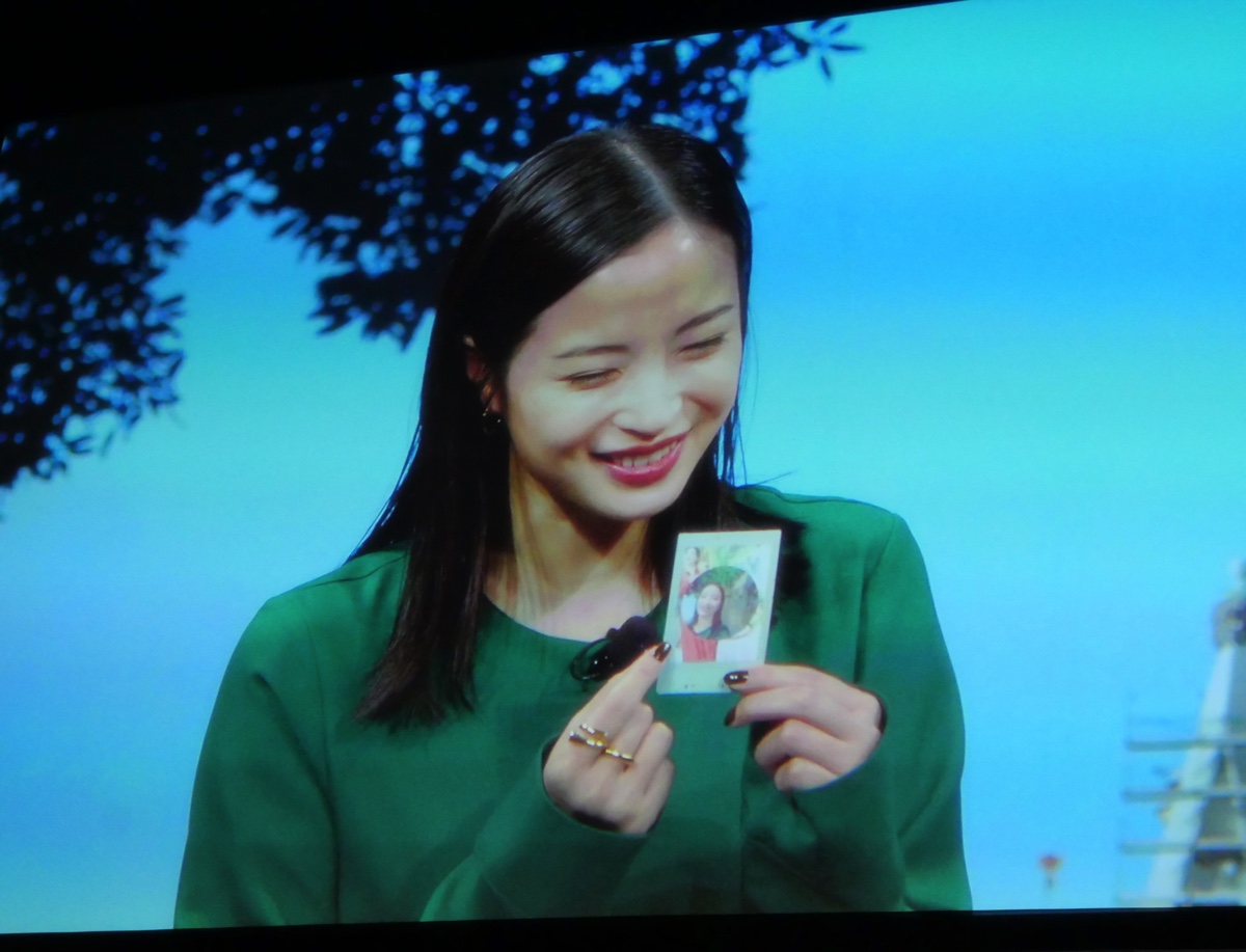 2人は登壇前に、この機能を使って撮影していたようだ。自撮りをする広瀬の下には、寝転ぶかたちで映り込む福田というお茶目な構図を披露。さらに福田は、メンバーであるゆめっちとかなでとの自撮りに、かなでの胴体をくっつけるというアイデアあふれる作例を発表した。