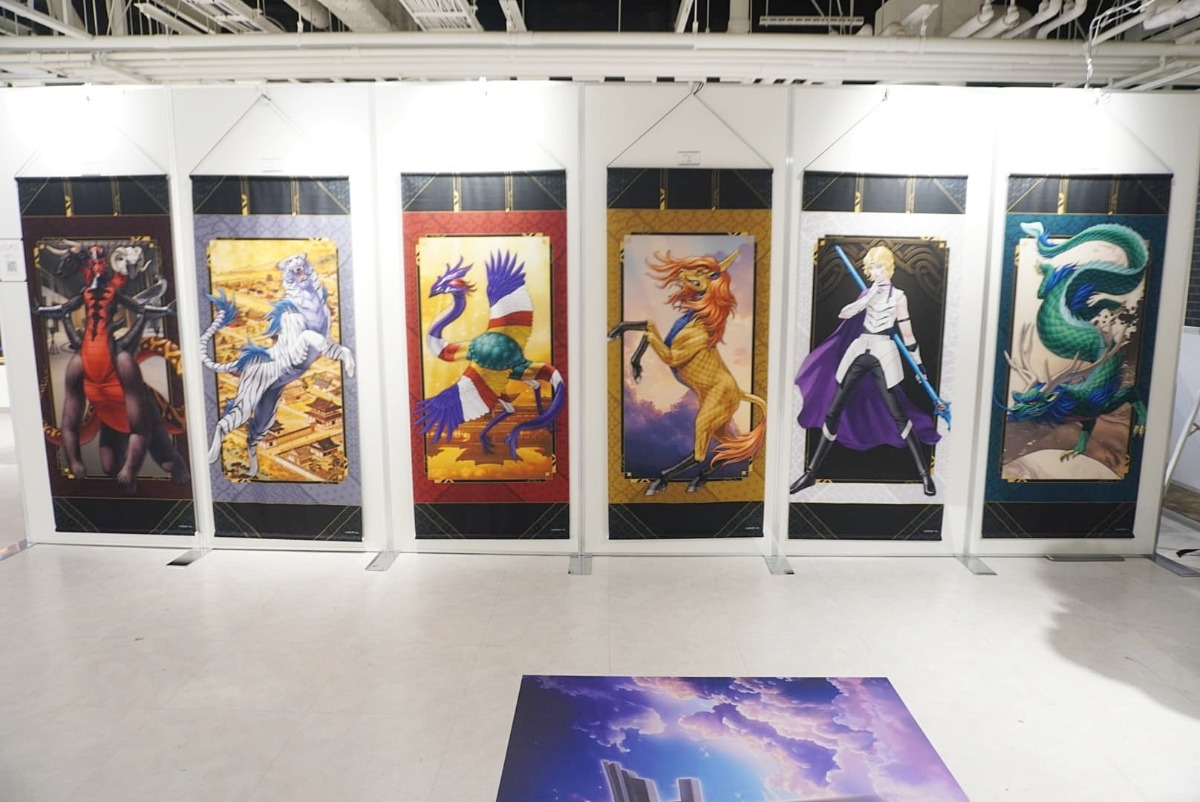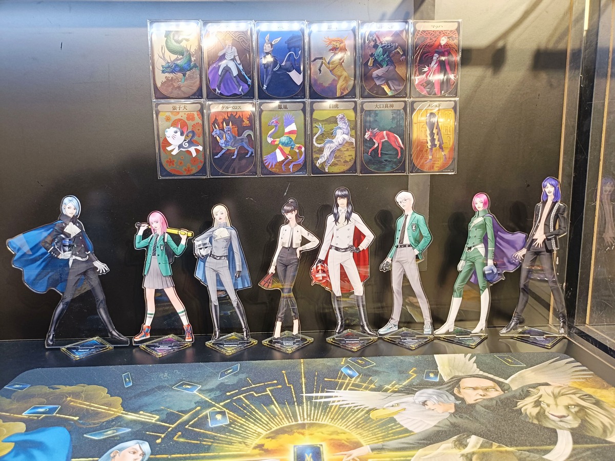さっそく店内に入ってみると、来場者の注目を集めるであろう展示スペースが設けられていた。「満月のツクヨミ&武内いつ」や「半月のツクヨミ&諏訪迅雷」など登場キャラクターの等身大パネルをはじめ、カードイラストを模したタペストリー、キービジュアルの巨大ポスター……等々、同作品のプレイヤーにとって馴染み深い展示物が整然と並んでいた。