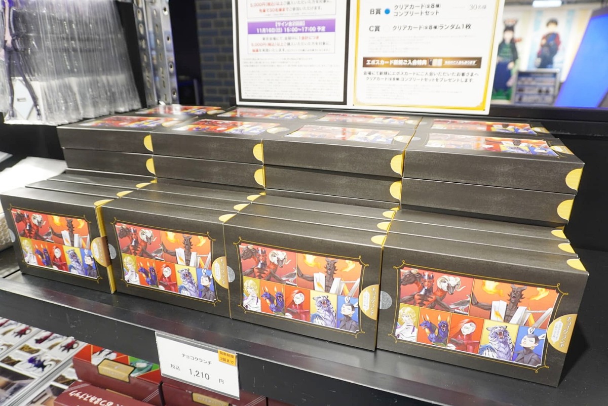 ショーケースの左側を見ると、今回のポップアップストア展開のために作られたであろう『神魔狩りのツクヨミ』食品が積まれている。バリエーションはチョコクランチとおつまみスナックの2種類。どちらもホログラムステッカー(全7種)がランダムで1枚封入されている。自分用だけでなく、お土産にも喜ばれそうなフードアイテムだろう。