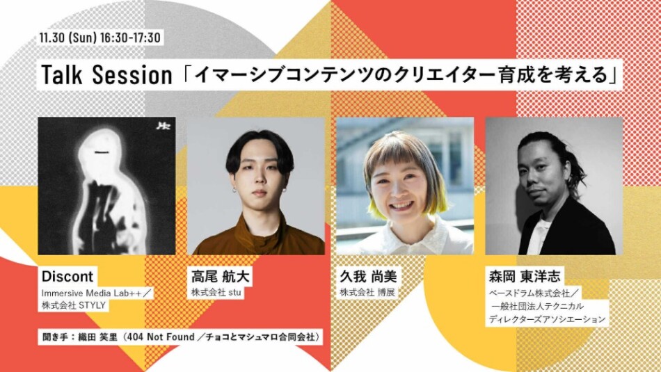 プロジェクトのキックオフとなるトークセッションも実施する。11月29日と30日に開催される第2回 テクニカルディレクションアワード受賞作品展・トークイベントの中で行われる。イベントには、Discont、高尾航大、久我尚美、森岡東洋志が登壇者として参加する。
