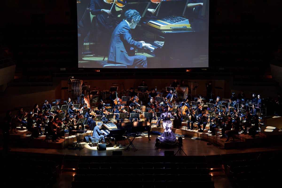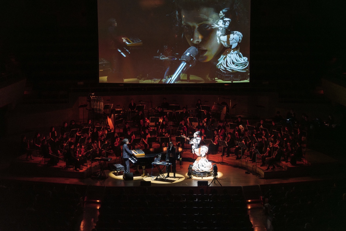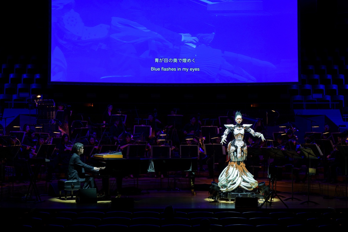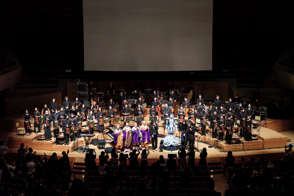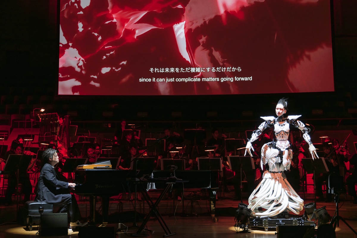 ステージには、これまでの「アンドロイド・オペラ」で活躍してきた「オルタ」ではなく、渋谷の亡き妻・マリアをモデルとした「アンドロイド・マリア」が初登場。気鋭のヴァイオリニスト・成田達輝をコンサートマスターに迎えた62名のスペシャルオーケストラ、藤原栄善、山本泰弘、柏原大弘、谷朋信という4人の高野山の僧侶による声明に加え、同期の電子音やリアルタイムでのAI会話、アンドロイド・マリアのボーカルなど、異なる要素が有機的に融合。さらにスペシャルゲストとして、グラミー受賞ベーシストのシャーロット・ケンプ・ミュール(Charlotte Kemp Muhl)も登場した。