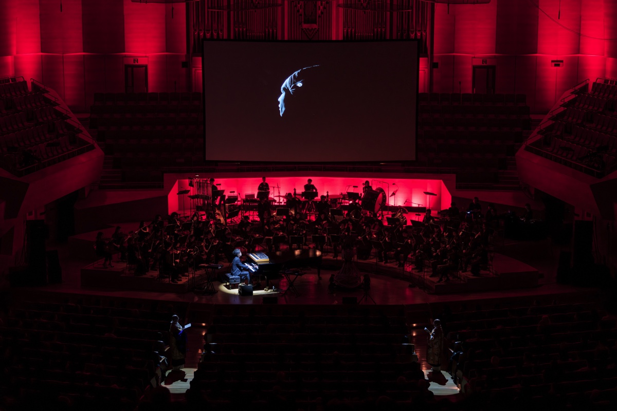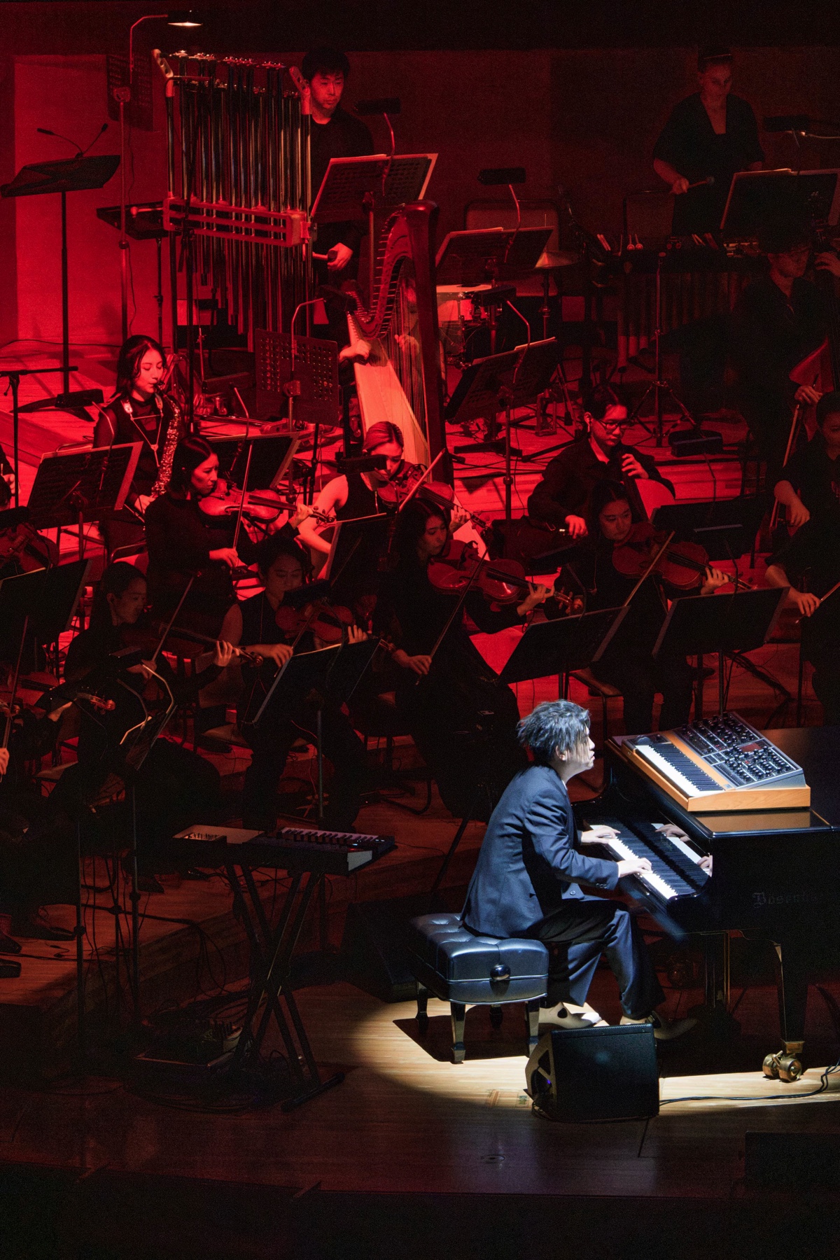 渋谷がシンセサイザー『MOOG ONE』をパイプオルガンのような音色で演奏した「Voices」では、その音にアンドロイド・マリアが即興的な歌声を重ねたり、ケンプ・ミュールがこの日のために書き下ろした詩を朗読する場面が印象的だった。