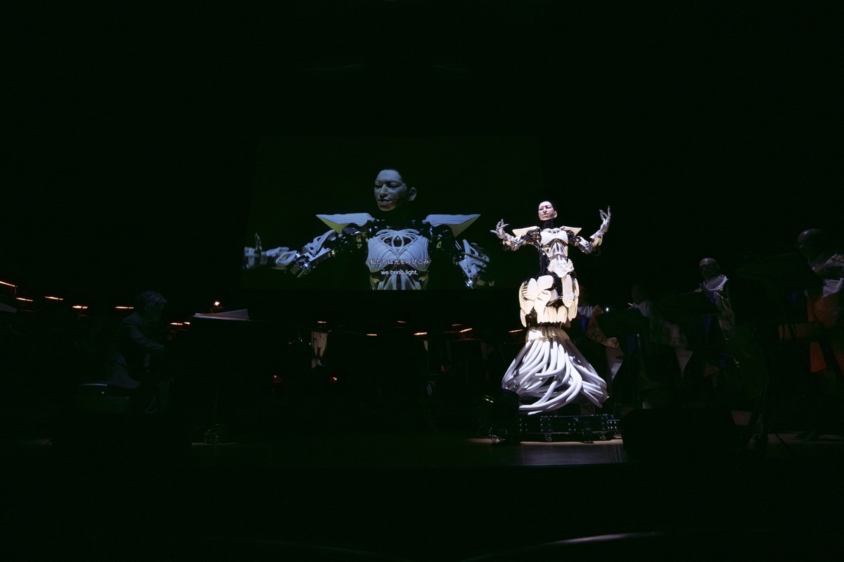 「I Come from the Moon」は、ショートフィルム「Kaguya by Gucci」のサウンドトラックをオーケストラによる重層的なアレンジで再構築したもので、マリアと僧侶の声との対照が美しく響き合う。音楽に呼応しながら姿を変え、激しく歌い踊るアンドロイドの姿は、まるでメッセージに反応して変容する化身のようであった。