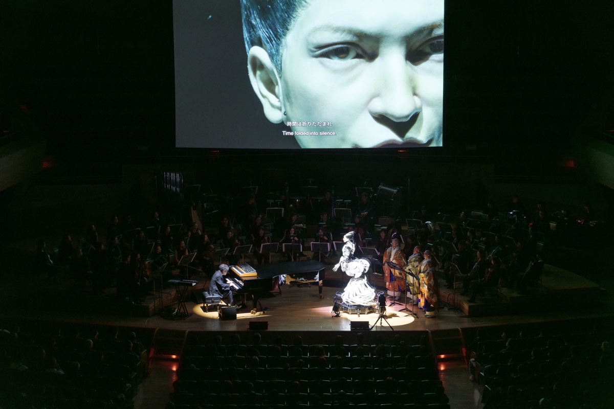 「BLUE」の余韻が残る中、舞台右手から僧侶たちが再び登場。藤原栄善が独唱を終えると、ホールに一瞬の静寂が訪れ、「Midnight Swan」へと続く。さらに「Recitativo 3」「I Come from the Moon」と楽曲が畳み掛けるように続き、観客は息をつく間もなく音と映像、アンドロイドと僧侶の動きといった多様な情報の奔流に飲み込まれていった。