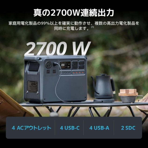 詳しくはこちらの記事をご覧いただきたいが、容量は2048WhでスマホやPCはもちろん、テレビやプロジェクターなどをカバー。2700W連続出力で電子レンジなども接続可能で、同社をして家電の99%をカバーできるという大容量バッテリーだ。まさに一家に一台あれば安心という頼れる電池の兄貴なのだ。ぜひこの機会にゲットして、その実力を確かめていただきたい。