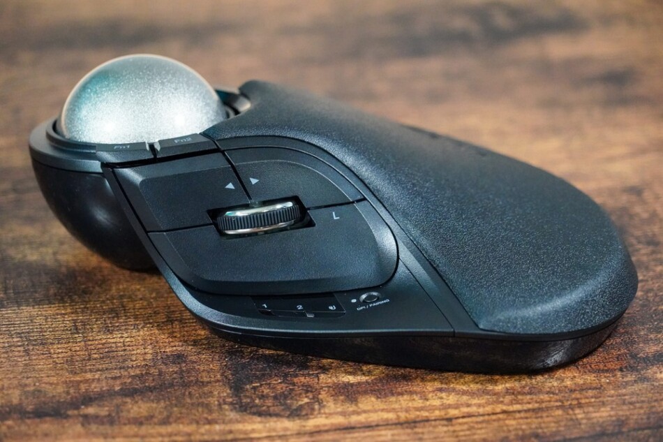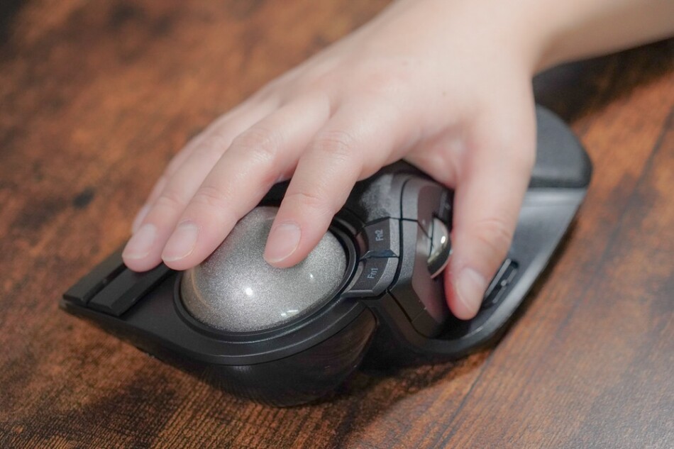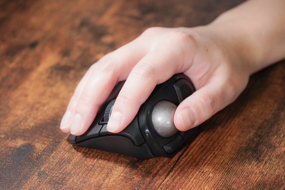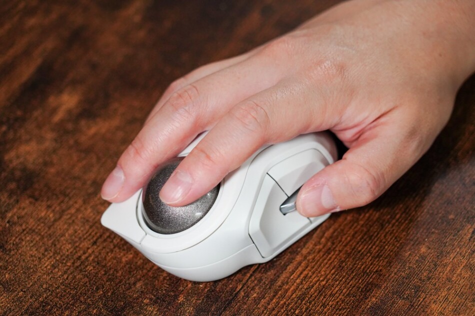 人差し指操作タイプは指の可動範囲が広く、快適にカーソル操作ができるのがメリットだ。本モデルでは、コンパクトな筐体ながらもボールの可動域を極限まで拡張しており、一度の操作でポインターを広範囲に動かすことができる。