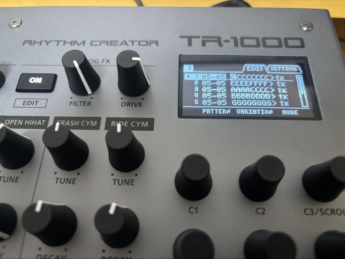 さらにTR-1000には、複数のパターンをつなげて「曲」として再生できるソング・モードが搭載されている。今回は作成したパターンをイントロ、ブレイク、ビルドアップ、フックとして並べ、完成した楽曲として構築。DAWなしでもTR-1000単体で楽曲制作が完結する。