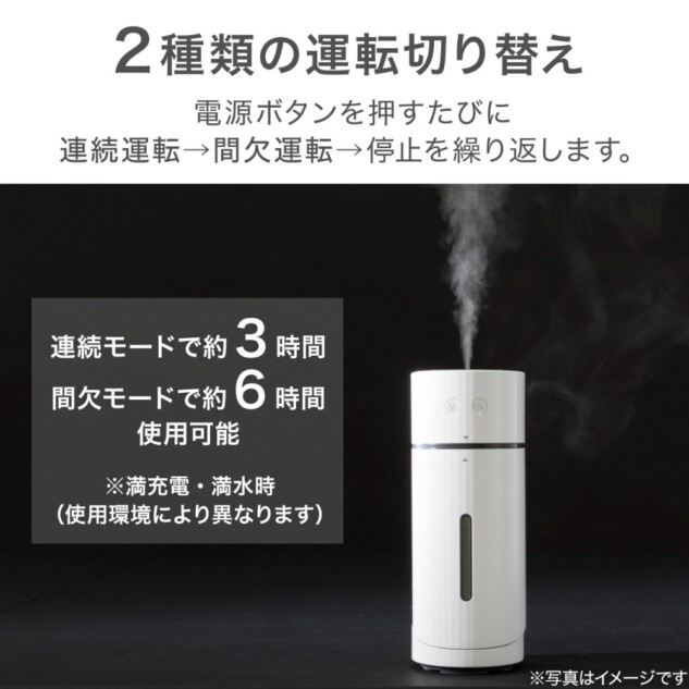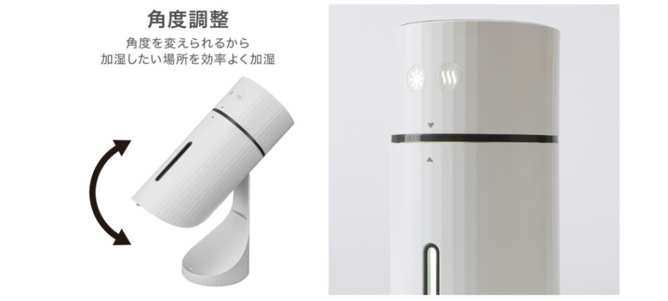 ミスト噴出口の角度は自由に調整でき、必要な場所だけ効率よく加湿してくれる。加湿量は連続運転と間欠運転の2種類に切り替えができ、オートオフ機能も搭載されている。