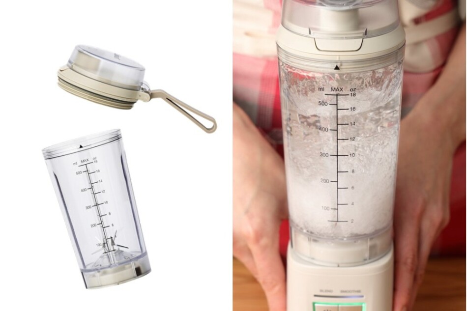 本体以外のパーツは水洗いができ、食器洗浄乾燥機にも使える。洗剤と水をブレンダーカップで撹拌することで簡単洗浄も可能だ。パーツは分離ができるため、タンブラーとして持ち運びして外に持っていける。ストラップも付いているため取り回しも容易だ。