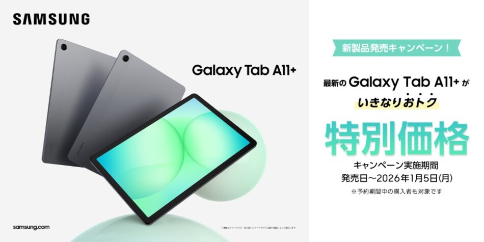 『Samsung Galaxy Tab A11+ (Wi-Fiモデル)』は39,600円(税込)、『Samsung Galaxy Tab A11+ 5G』は47,300円(税込)で販売される。2026年1月5日まで、特別価格として安く購入できる発売キャンペーンが実施中だ。