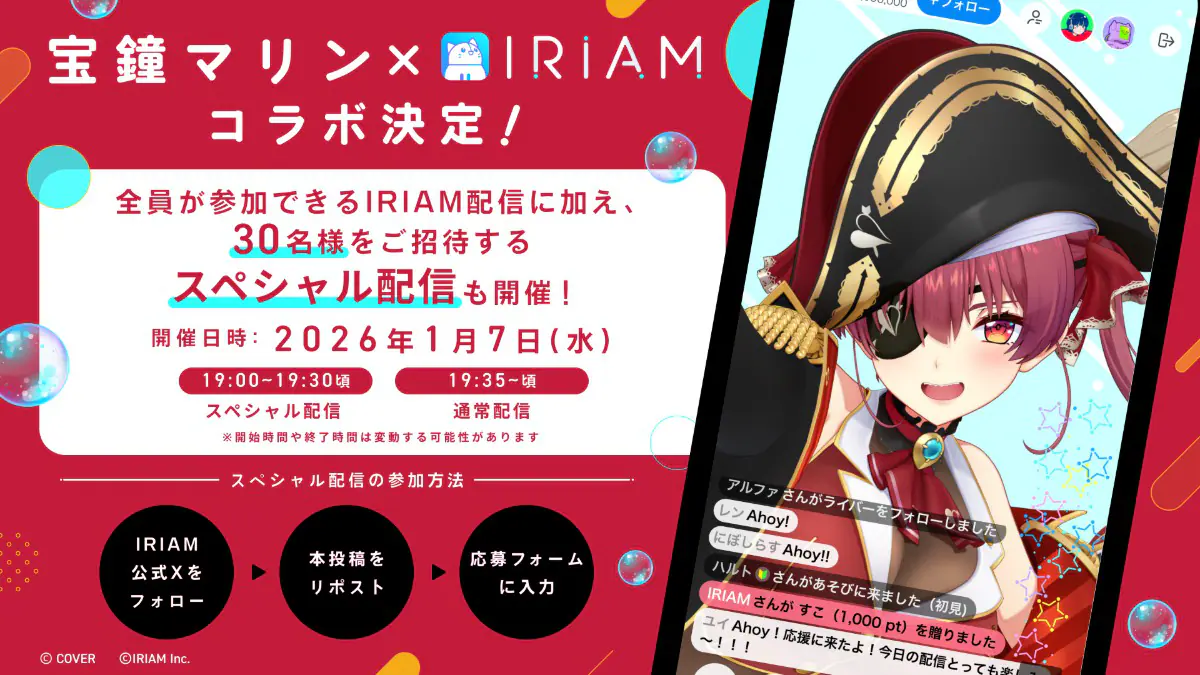 IRIAMは、ホロライブ3期生・宝鐘マリンとのコラボとして2026年1月7日にライブ配信を行うと発表した。