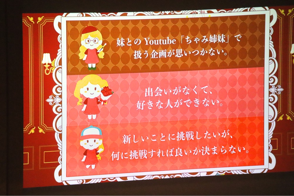 ゆうちゃみさんの悩みは、「妹とのYouTube企画が思いつかない」「出会いがなくて好きな人ができない」「新しいことに挑戦したいが決まらない」という3つ。