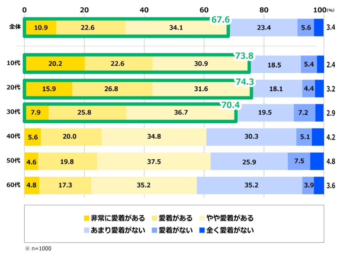 「あなたは、対話型AIに対して愛着がありますか」という質問については、67.6%の回答者が「はい」と回答し、10~30代では「はい」の割合が全体平均より高かった。