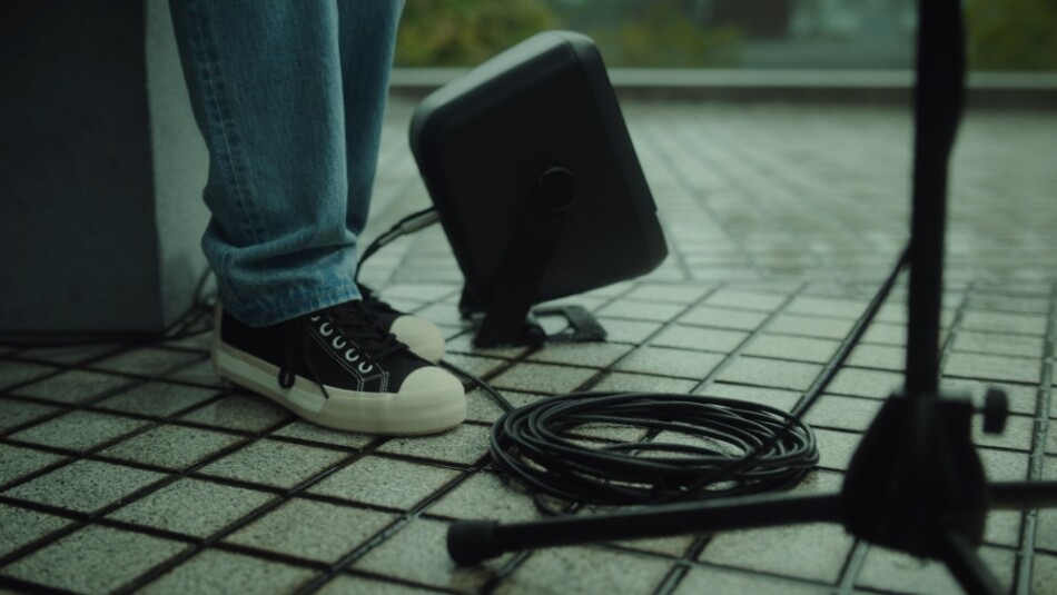 音量やマスターEQなどの操作部は全てフロントパネルに集約されている。また、床置き以外にも市販のマイクスタンドへの取り付けも可能だ。
