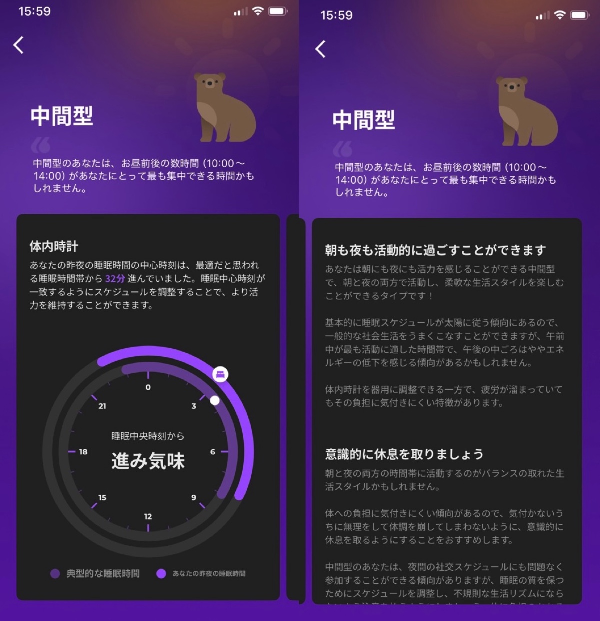 また、睡眠データから自分が夜型なのか朝型なのかも教えてくれるので面白い。ちなみに筆者は中間型だった。以前はおそらく夜型だったのだが、少し前から愛犬をお迎えして規則正しい生活を送るようになったため、少しずつ朝型に寄っているのかもしれない。体の変化を可視化すると、そういった外的要因の影響にも気付くことができる。