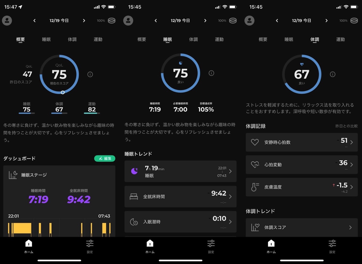 こちらが『SOXAI RING 2』によって検出された筆者の生体データだ。項目は「概要」「睡眠」「体調」「運動」の4つとなっており、それぞれ細かいデータを踏まえた総合的な数値をトップに出してくれているので、わかりやすい。