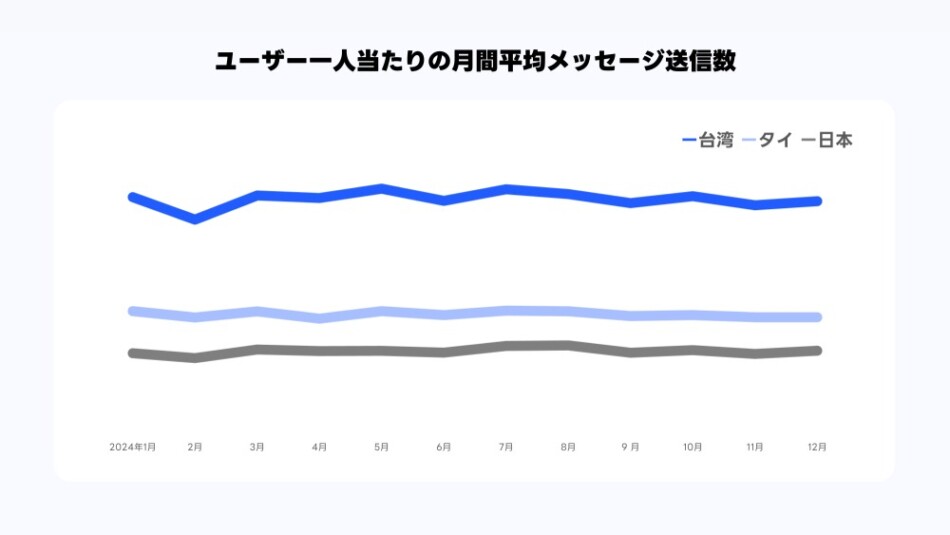 ユーザー一人当たりの月間平均メッセージ送信数は台湾が最も多く、タイの約2倍、日本の約3倍だと判明した。